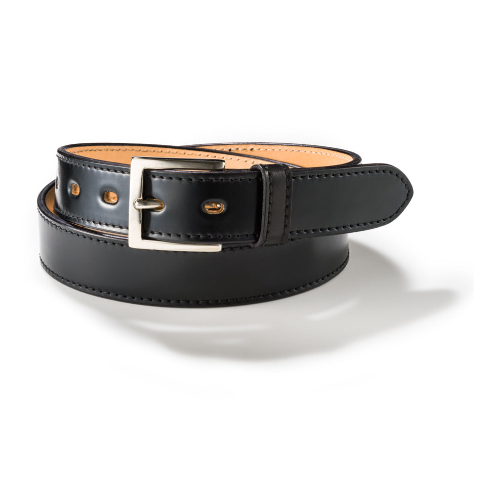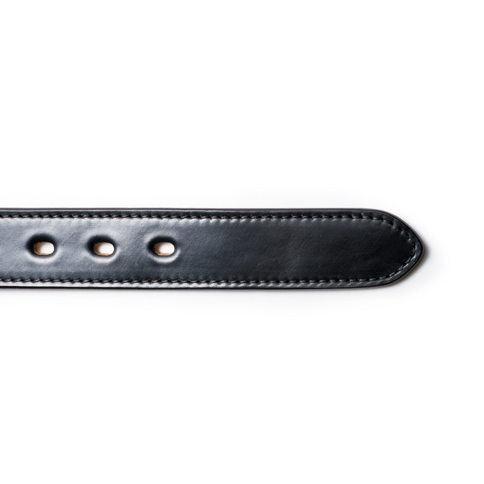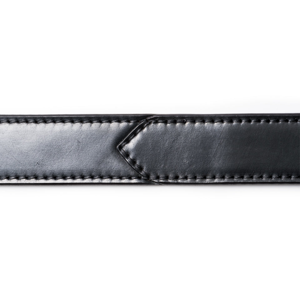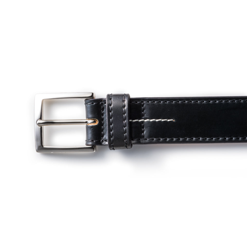 深く美しい光沢と驚くような馴染みが革好きを魅了するHorween社のコードバンと相性の良いドイツ産ベンズを組み合わせたセミカジュアルベルトです。サイドに施したヘヴィーステッチとやや大きめのホールはカジュアルな印象ですが、正統派のバックルを用いることで、様々なスタイルに合せやすい万能モデルです。オリジナルポーチ付き。