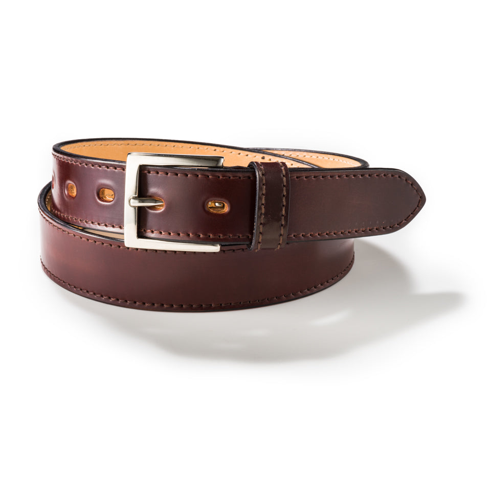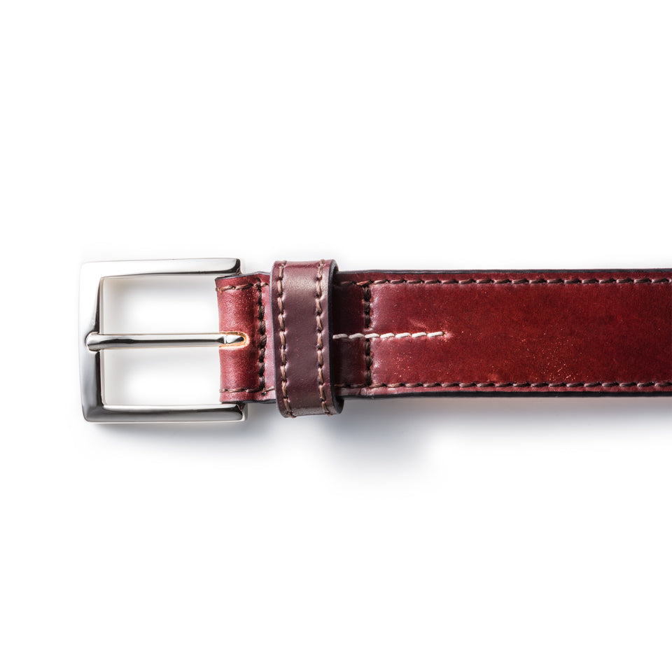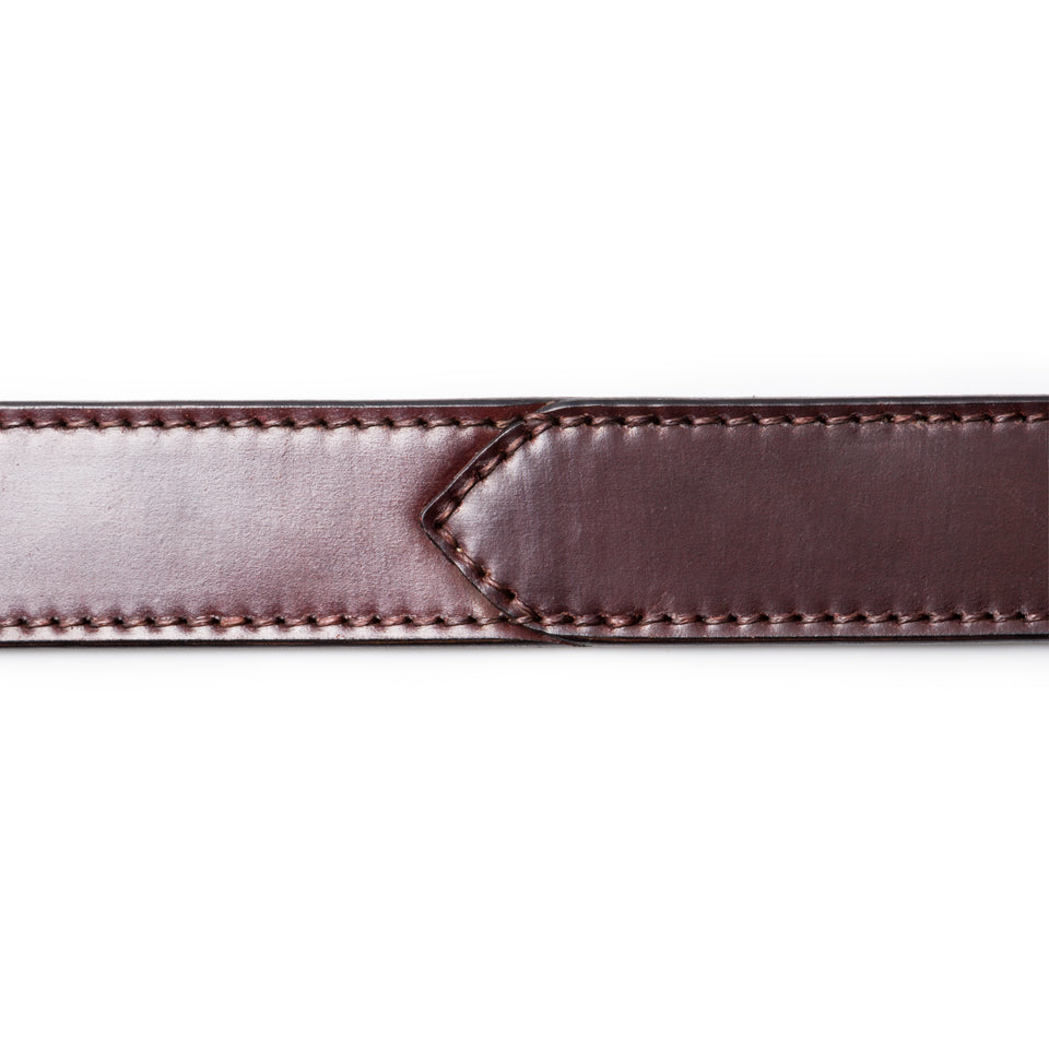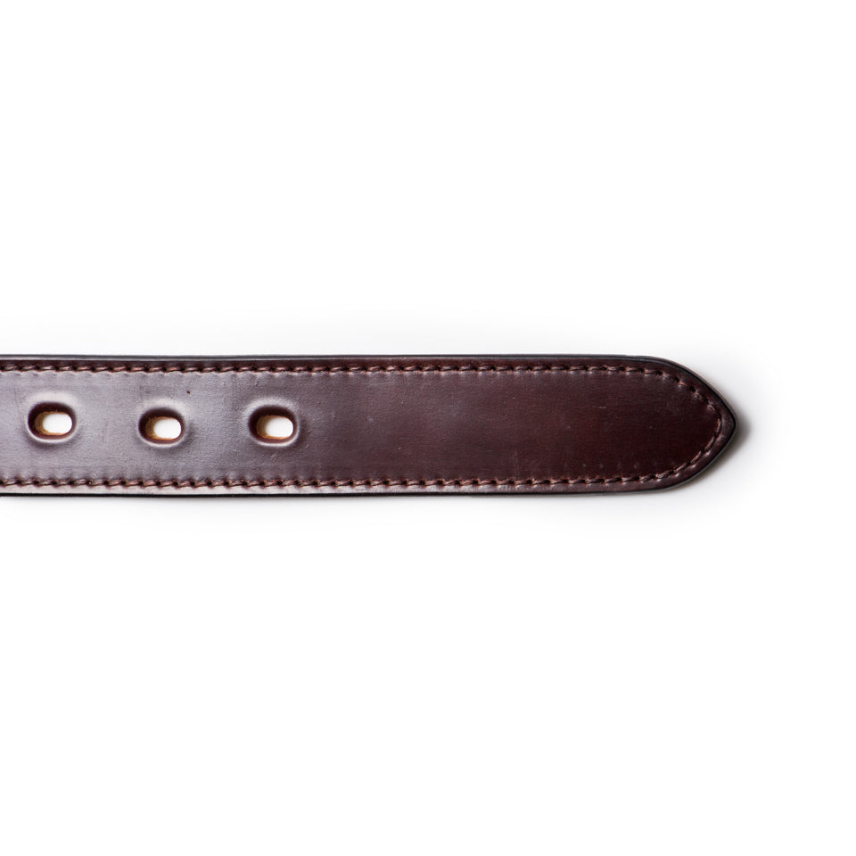 深く美しい光沢と驚くような馴染みが革好きを魅了するHorween社のコードバンと相性の良いドイツ産ベンズを組み合わせたセミカジュアルベルトです。サイドに施したヘヴィーステッチとやや大きめのホールはカジュアルな印象ですが、正統派のバックルを用いることで、様々なスタイルに合せやすい万能モデルです。オリジナルポーチ付き。