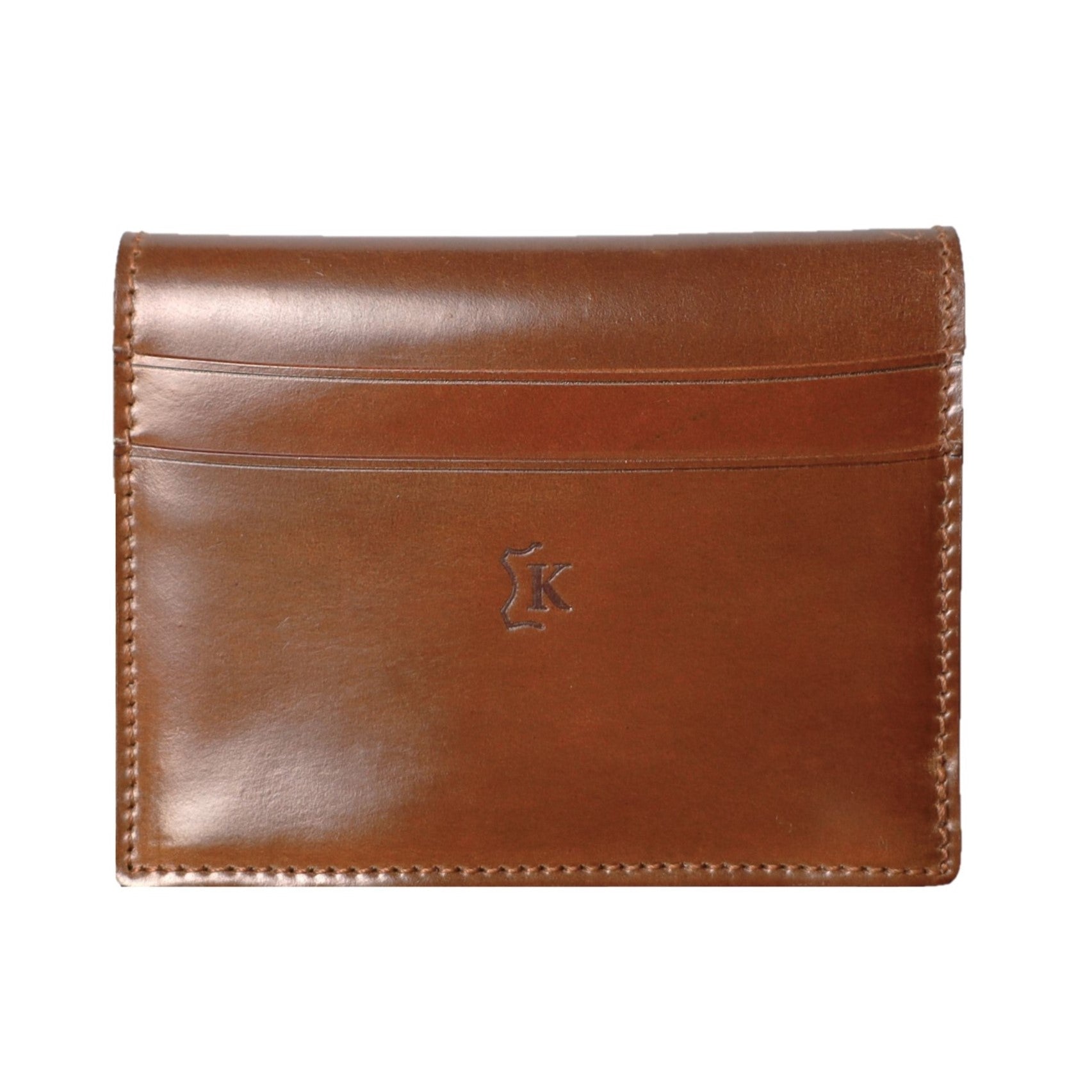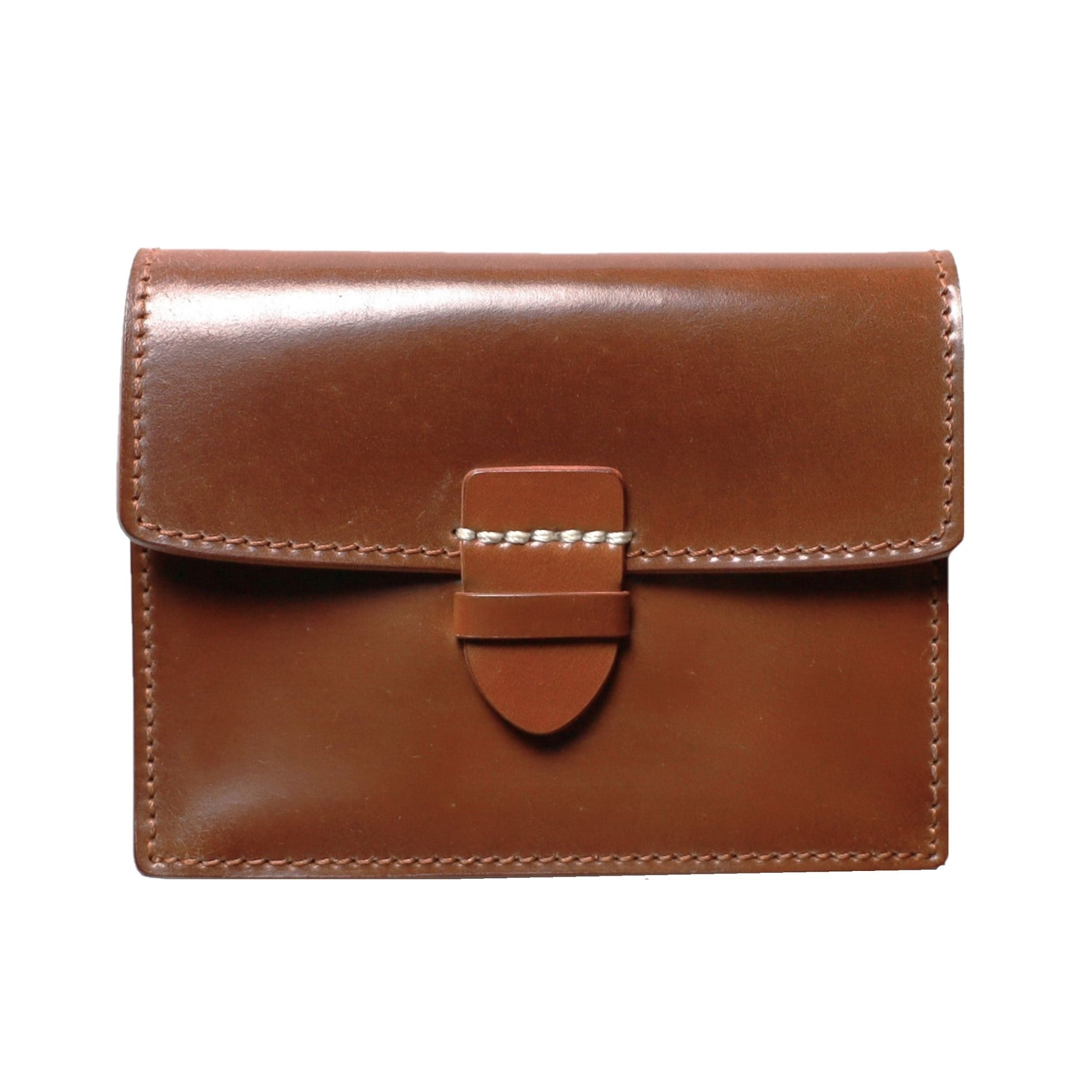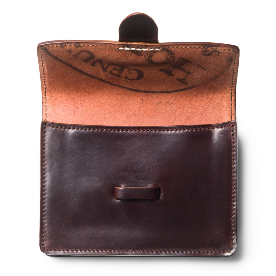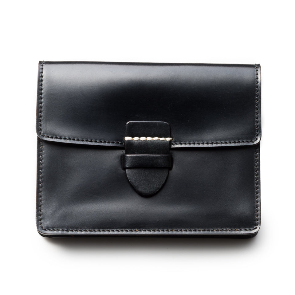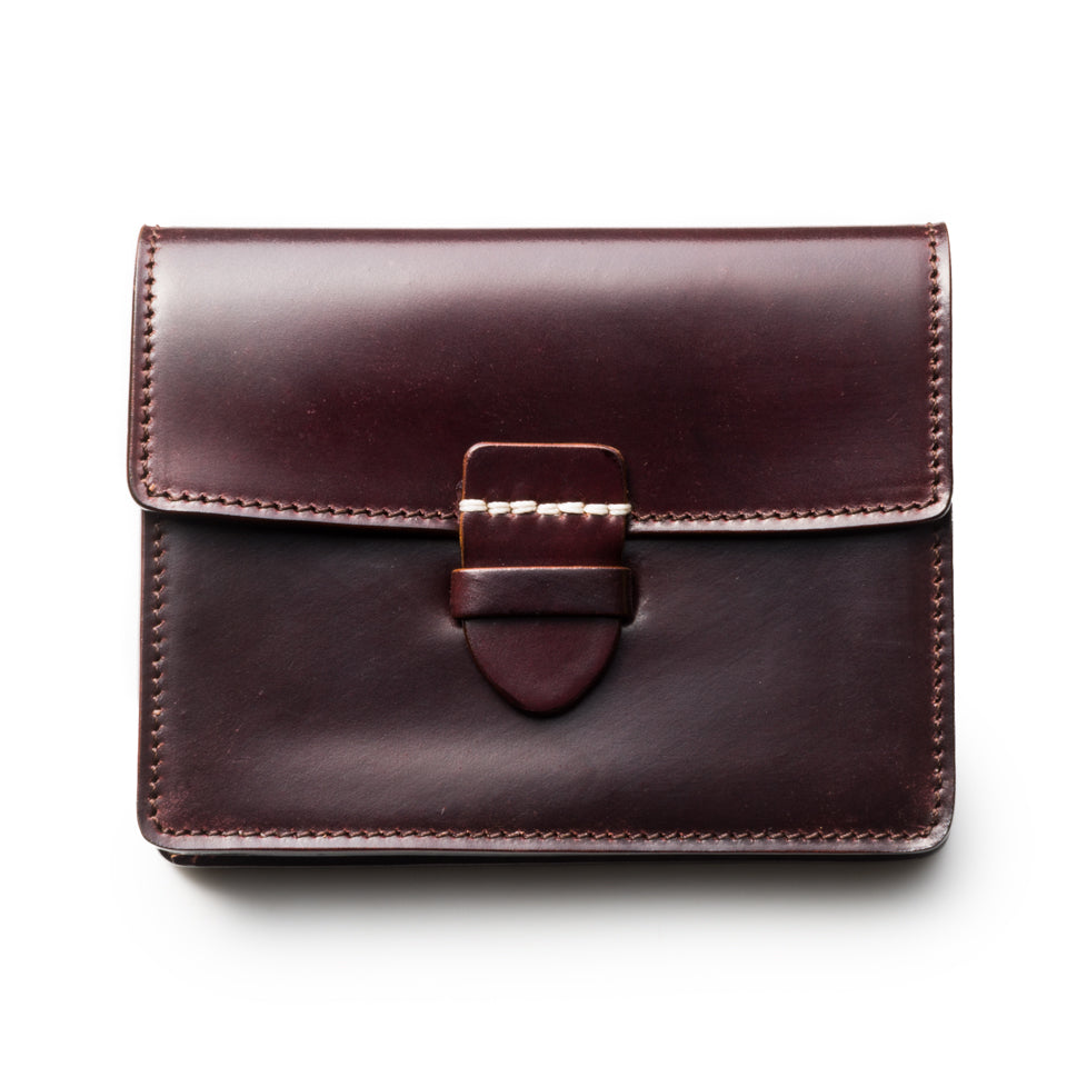 Horween社のコードバンを使用した贅沢なスモールウォレットです。中央に入るアイコンのホワイトステッチがユニークな作りで、小銭やカード類などマルチに収納できる汎用性が魅力です。一部に薄く丈夫なカンガルー革を使用しており、全て『革』を使った拘りの逸品です。マルチポケット1 カード入れ2