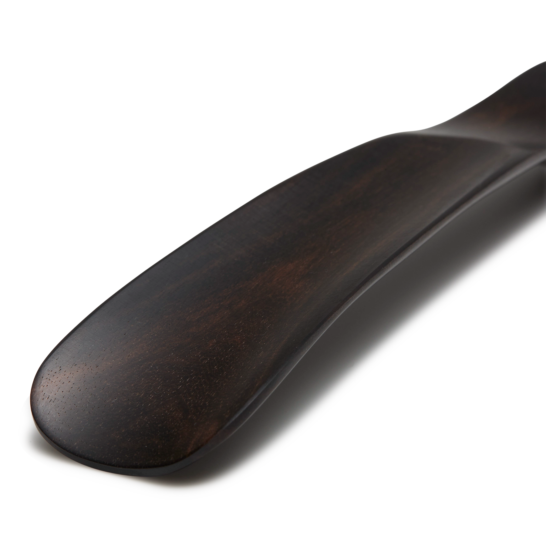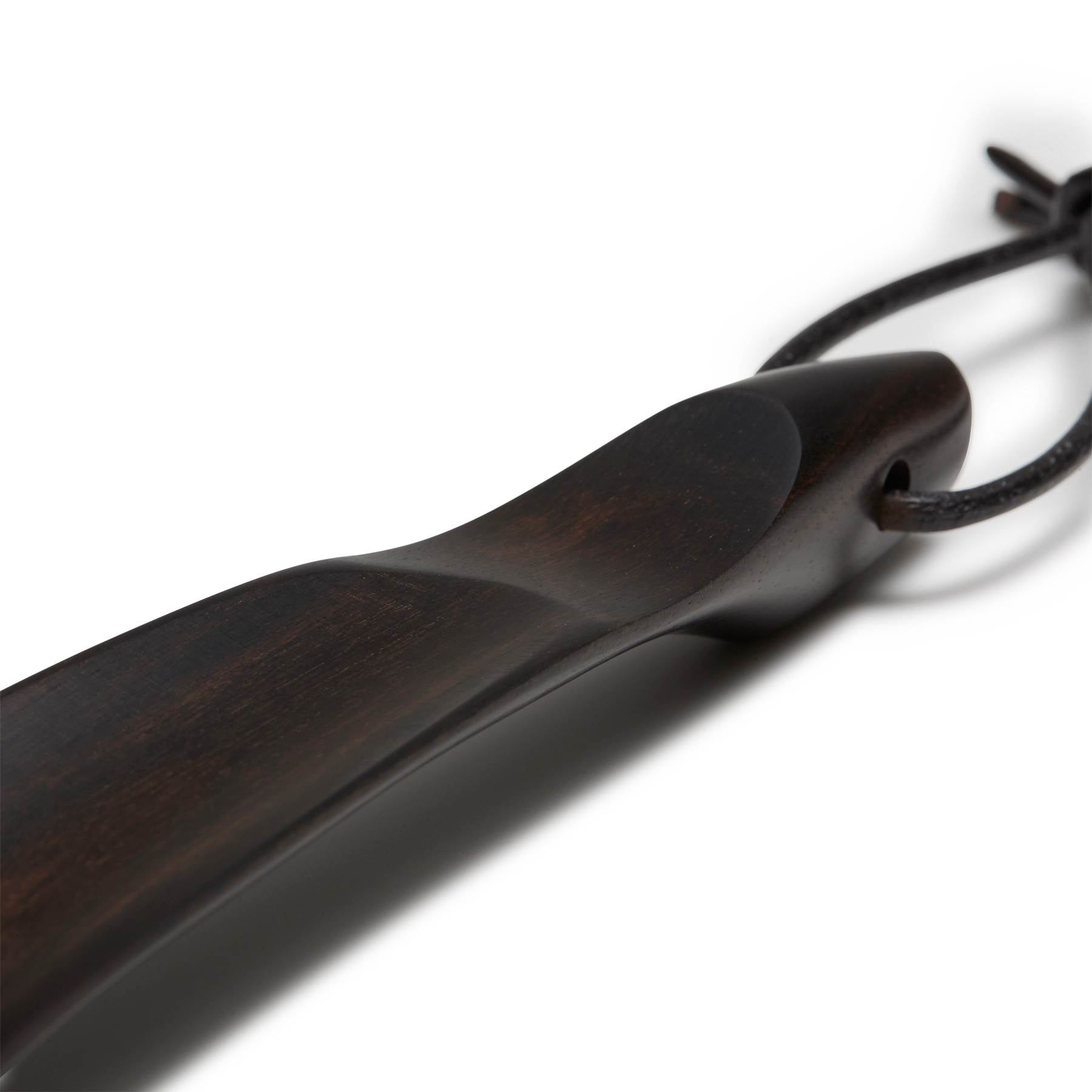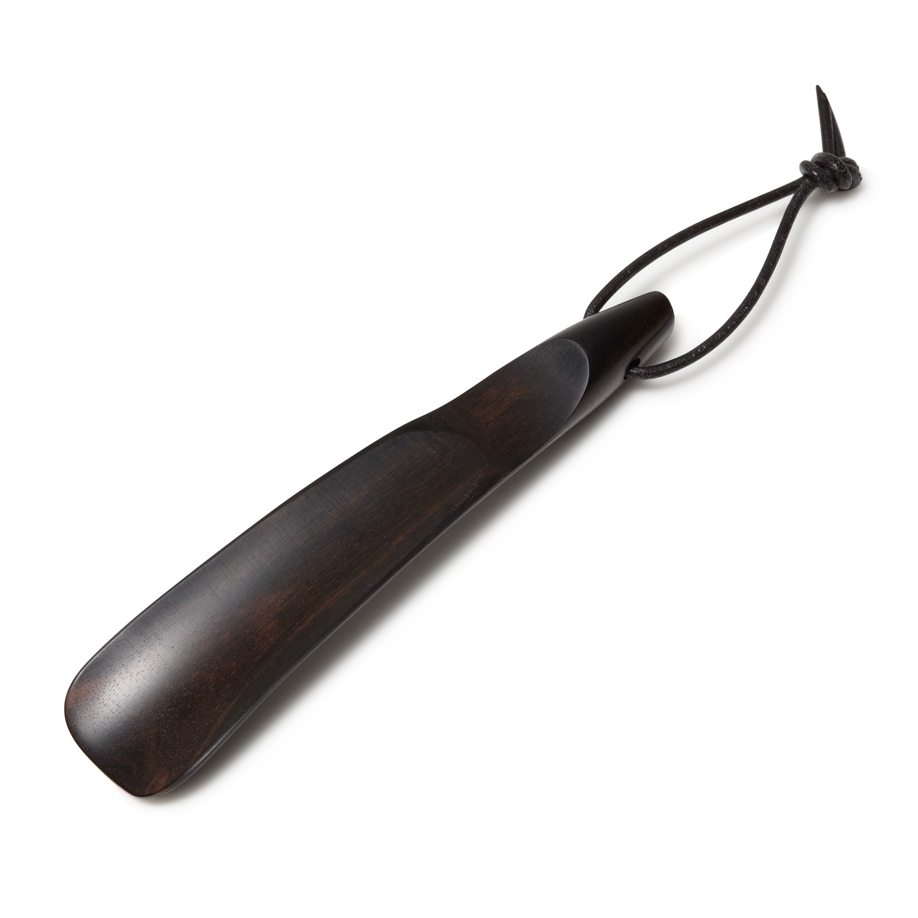 広島県廿日市市にある倉本杓子工場のしゃもじ職人が手作業で仕上げたシューホーンです。強度があるもそれゆえ加工や削り出しが難しいとされる高級木材 黒檀を一点一点丁寧に磨き上げ美しいフォルムを生み出しています。革紐は靴のウェルト素材で作られており、見て楽しみ、触れて愛着の湧く仕上がりです。拘る人達が納得できる逸品です。