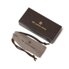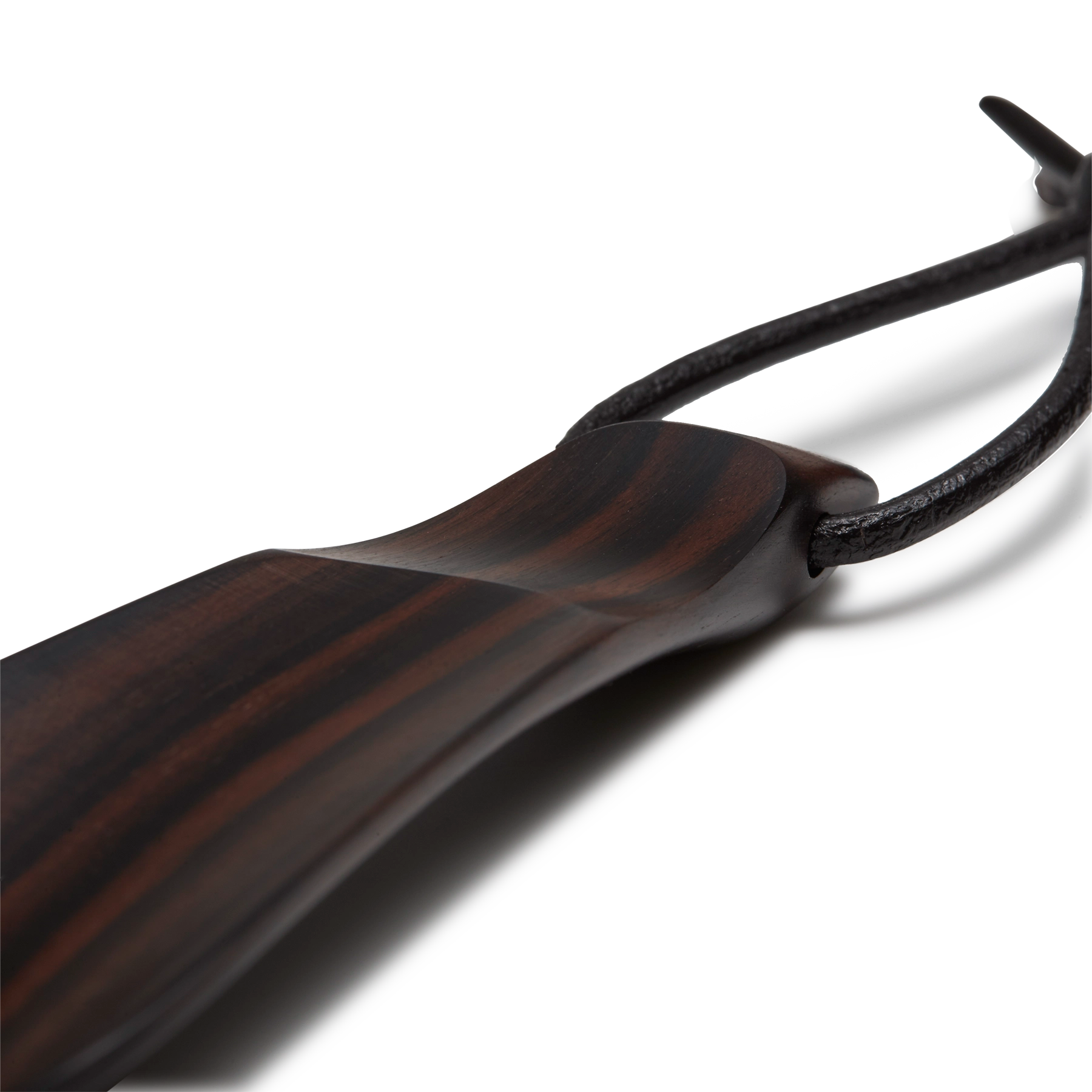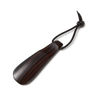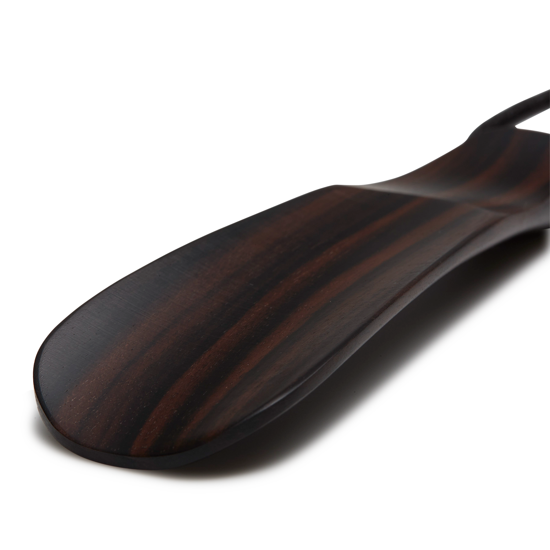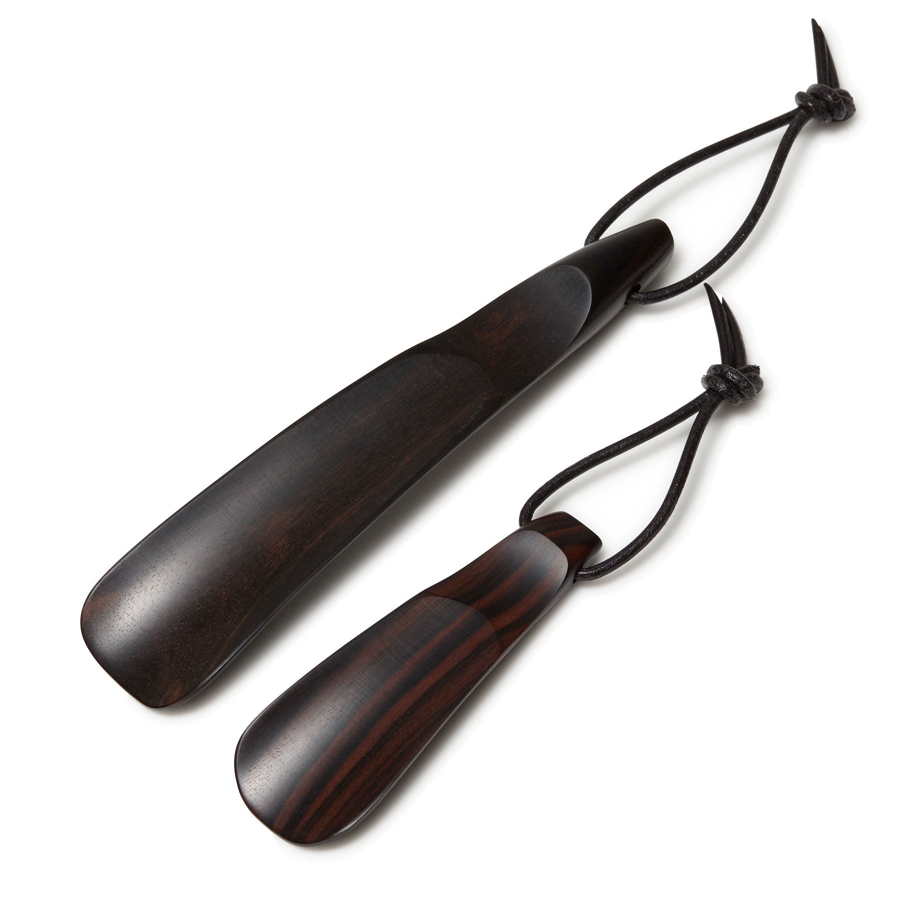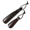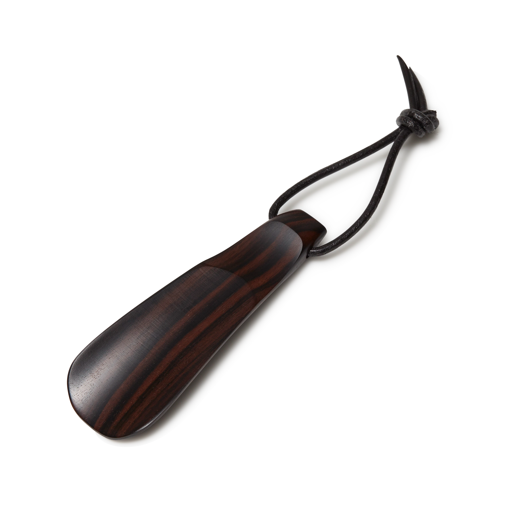 広島県廿日市市にある倉本杓子工場のしゃもじ職人が手作業で仕上げたシューホーンです。強度があるもそれゆえ加工や削り出しが難しいとされる高級木材 黒檀を一点一点丁寧に磨き上げ美しいフォルムを生み出しています。革紐は靴のウェルト素材で作られており、見て楽しみ、触れて愛着の湧く仕上がりです。拘る人達が納得できる逸品です。