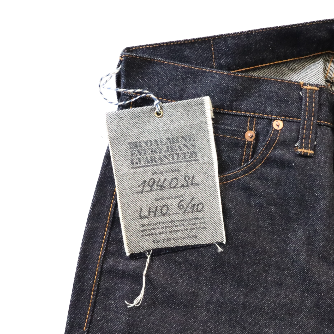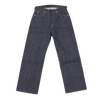 物資制限が厳しかった第二次世界大戦時(1940年代)のジーンズをオマージュ。股上の深いワイドストレートのシルエット。バックシンチやリベット、縫製箇所が削ぎ落とされたデザインを黒い鉄製オールドミシンを使用して美しく仕上げました。