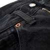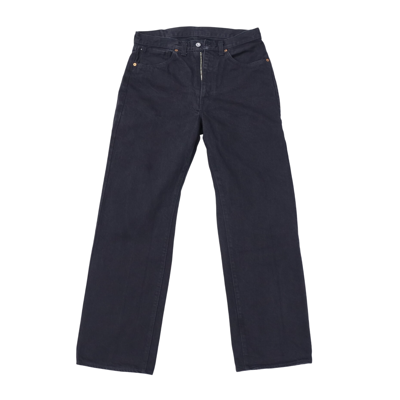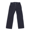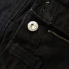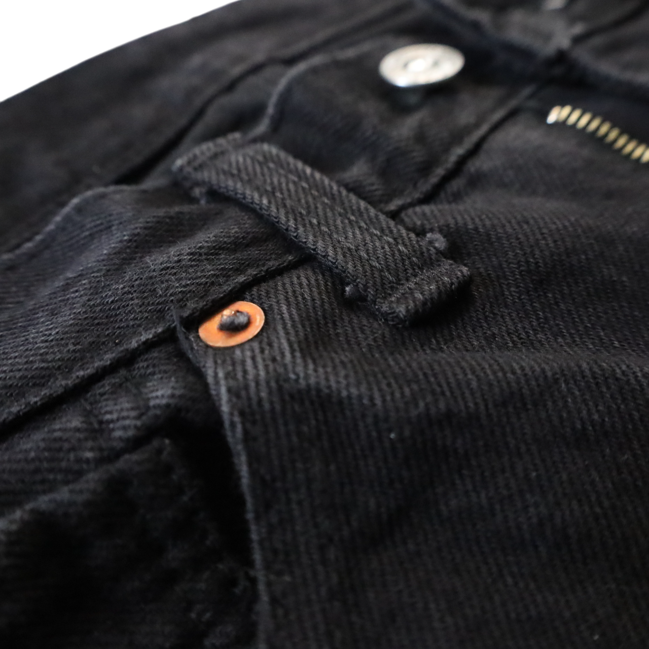 物資制限が厳しかった第二次世界大戦時(1940年代)のジーンズをオマージュ。股上の深いワイドストレートのシルエット。バックシンチやリベット、縫製箇所が削ぎ落とされたデザインを黒い鉄製オールドミシンを使用して美しく仕上げました。
