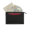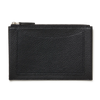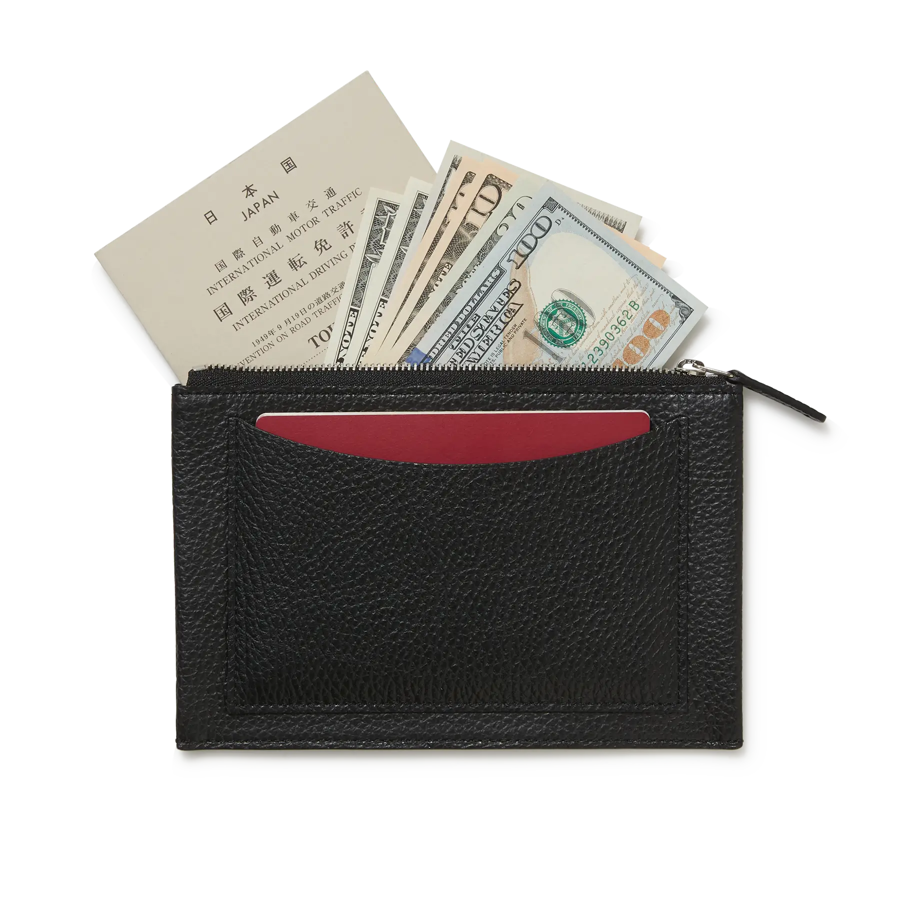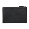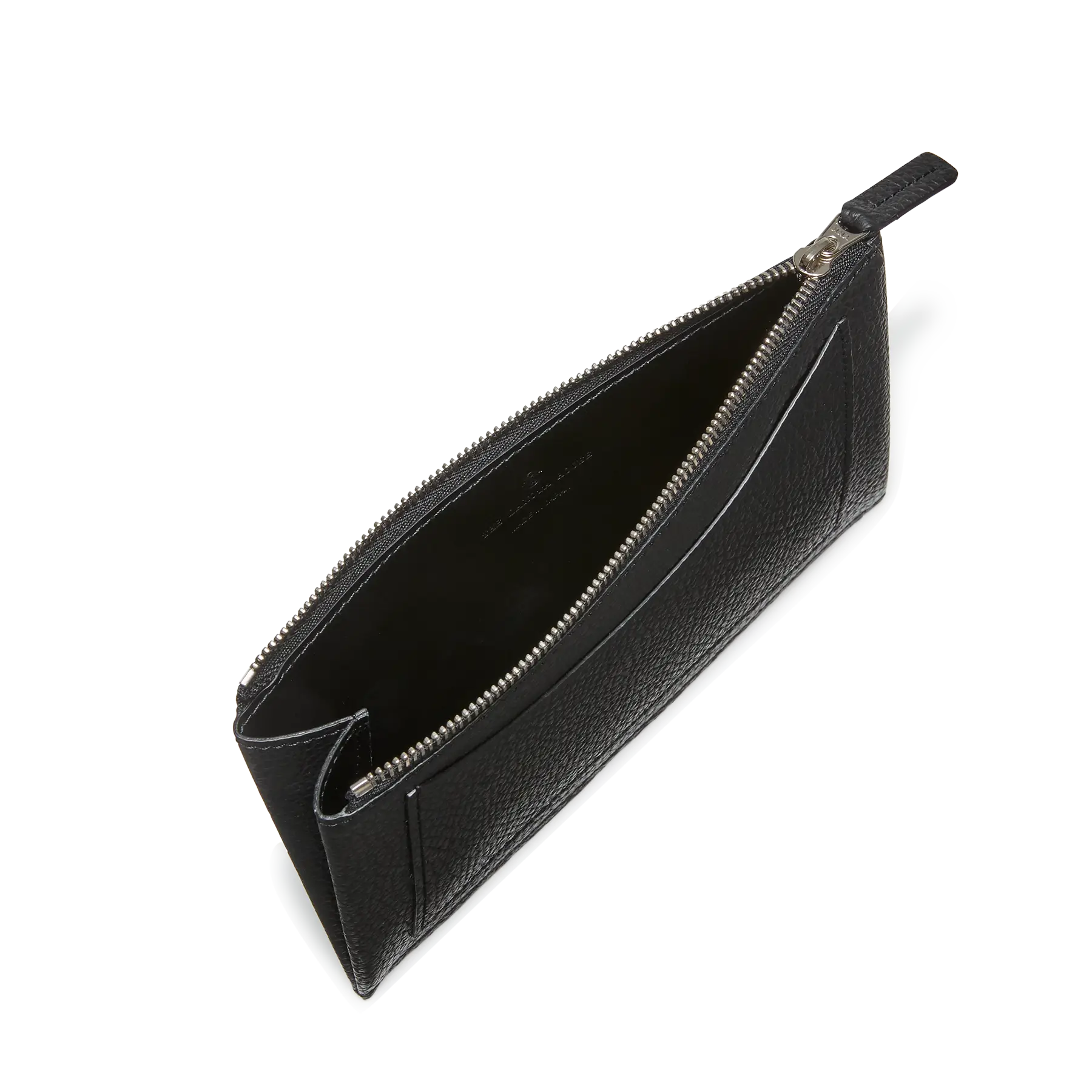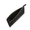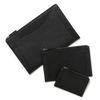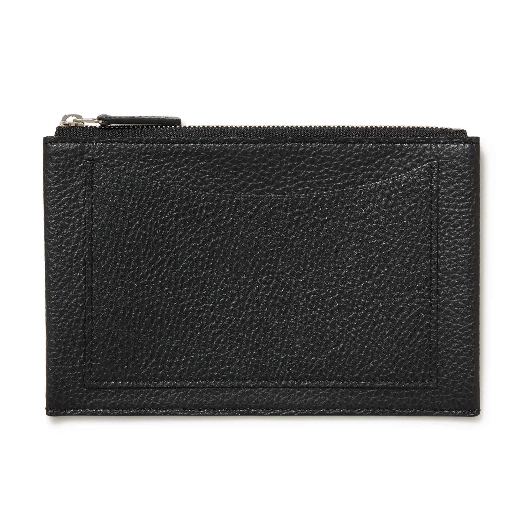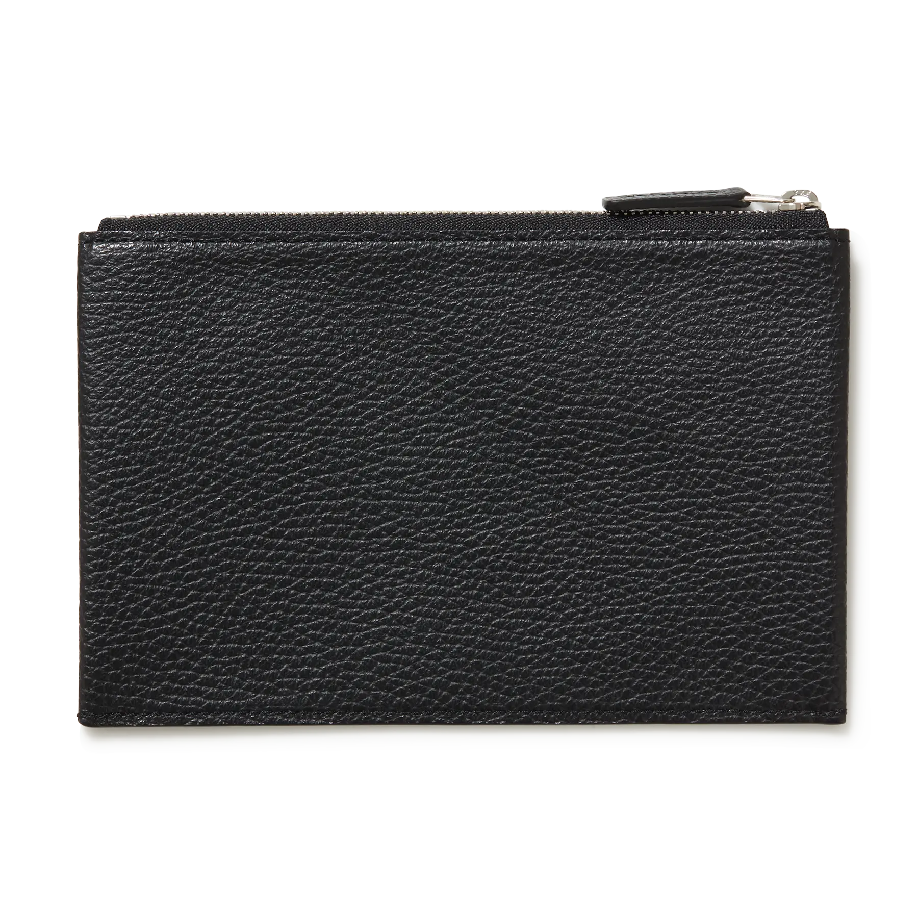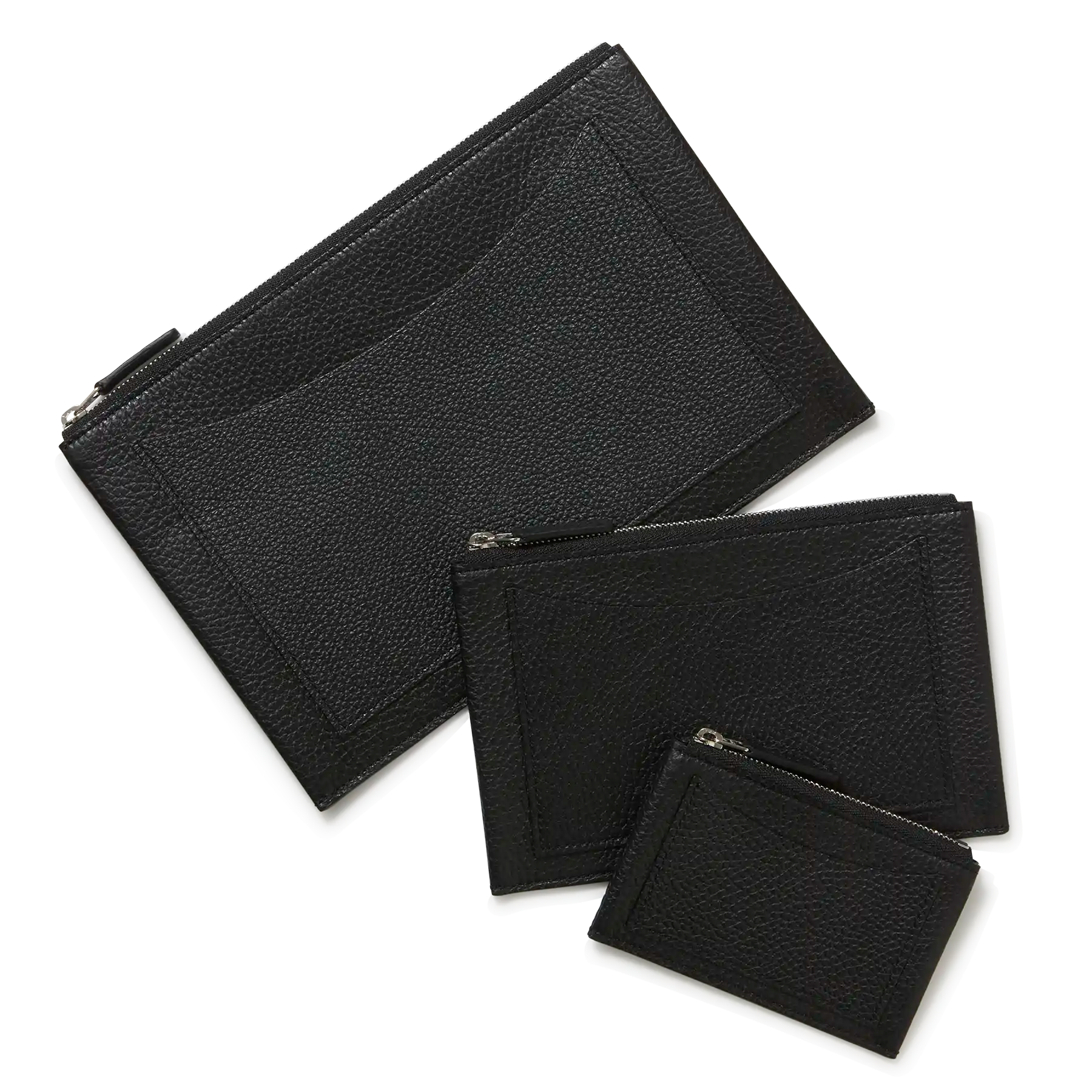 3サイズで展開されるフロントポケットジップケースのミディアムサイズ。フロントにポケットをあしらい、両サイドにマチを設けたユニークなデザインは、上部を組み立て裏面からサイドを縫い合わせた後、表裏をひっくり返して底部分を縫う、ひと手間加えた本来は行われない拘りの作りです。表面はキズが目立ちにくく、しなやかで発色に優れたイタリアンレザー、大切な物を入れるケース内も重要なものと考え、ライニングには表面の革より上質な国産のキップレザーを使用しております。また、表裏ともにブラックで統一したオールブラック仕様により、高級感が増し、中身の色を引き締めて目立たせる効果があります。ミディアムサイズのフロントポケットはパスポートサイズ、ケース内部には預金通帳やポストカード、紙幣、領収証の収納に便利です。