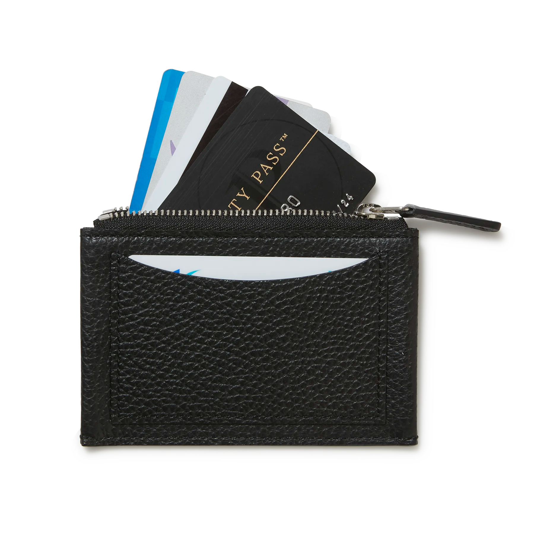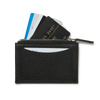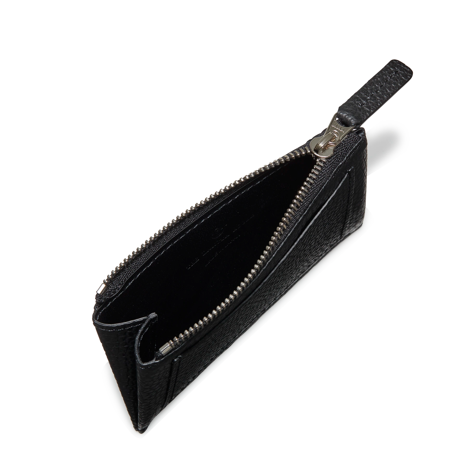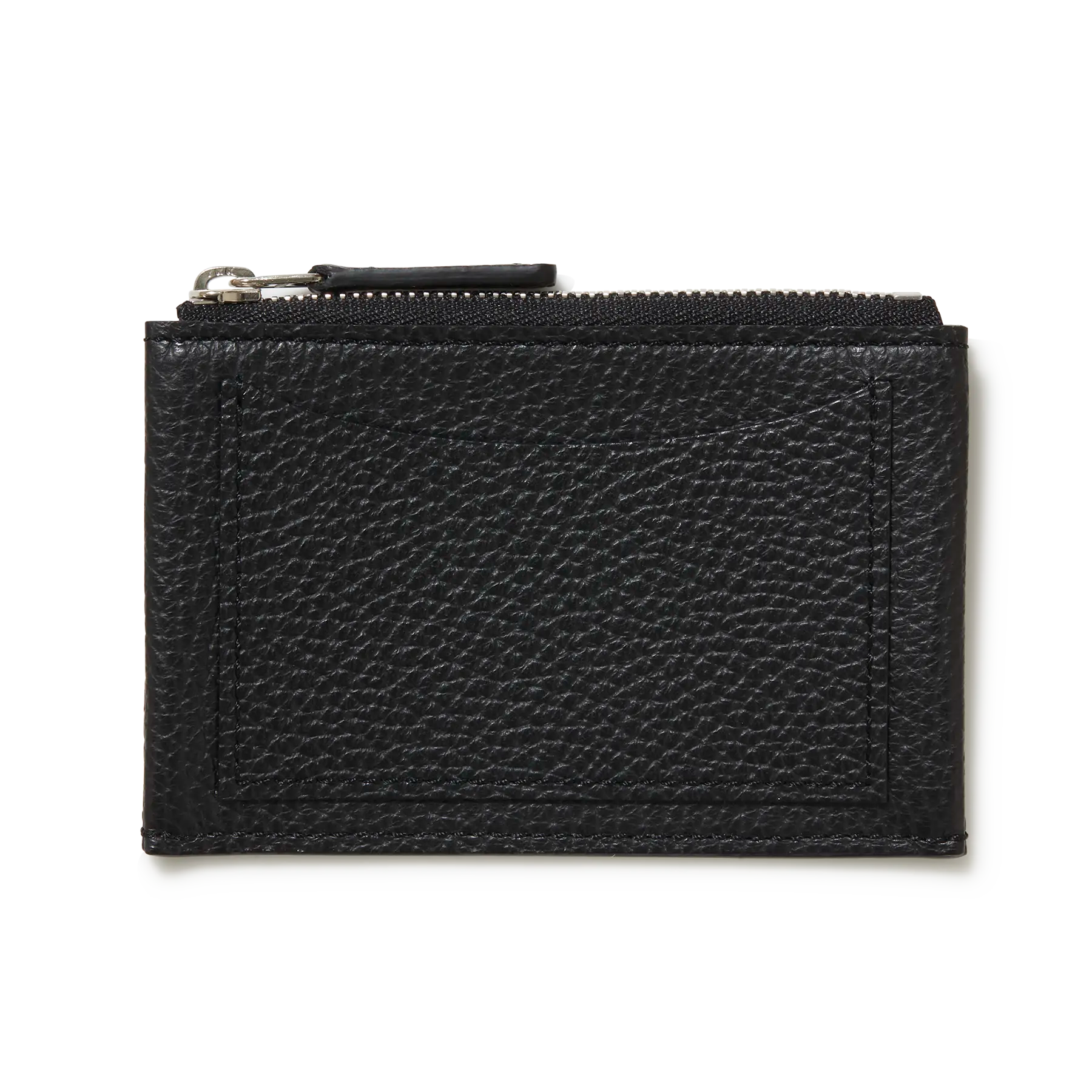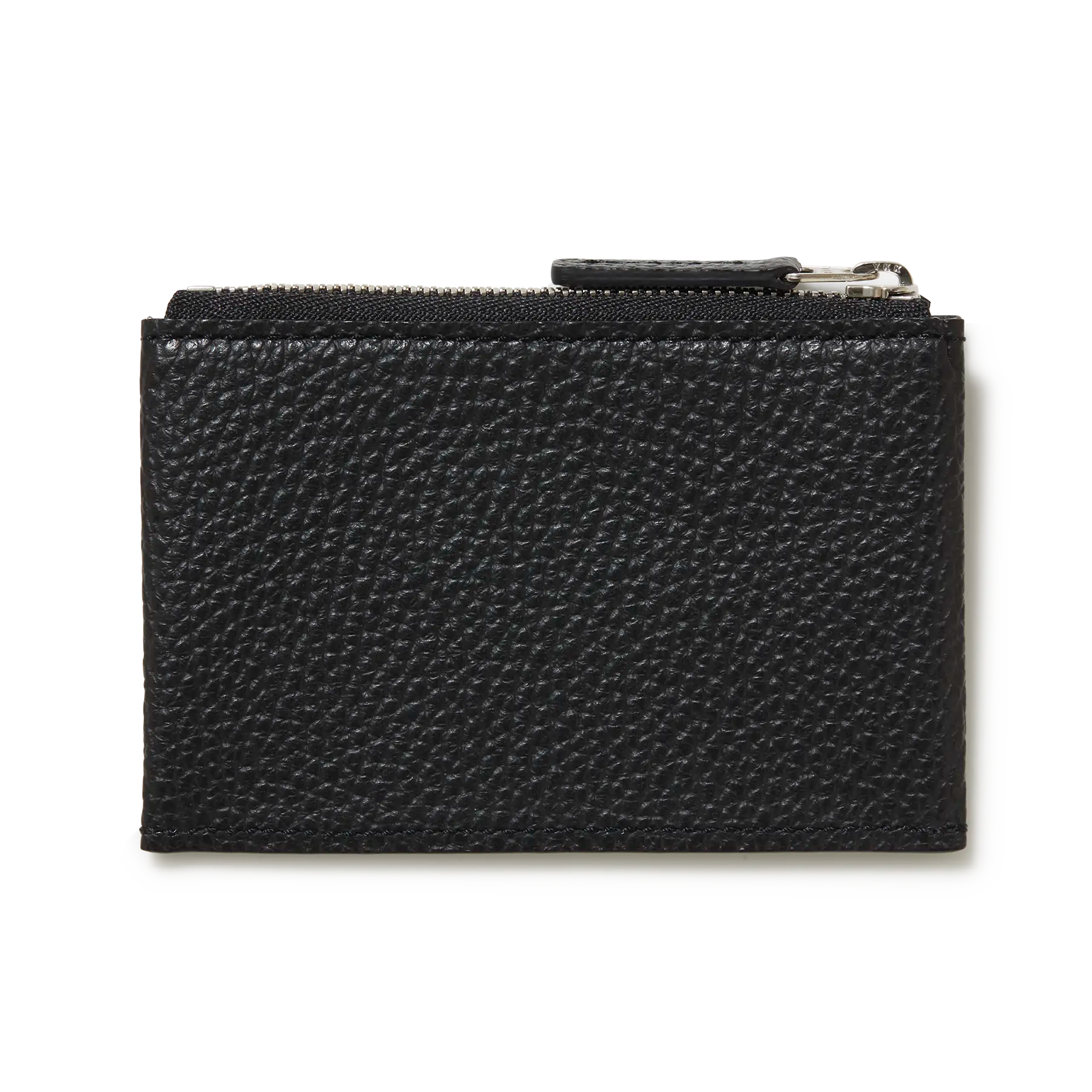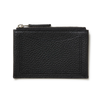 3サイズで展開されるフロントポケットジップケースのスモールサイズ。フロントにポケットをあしらい、両サイドにマチを設けたユニークなデザインは、上部を組み立て裏面からサイドを縫い合わせた後、表裏をひっくり返して底部分を縫う、ひと手間加えた本来は行われない拘りの作りです。表面はキズが目立ちにくく、しなやかで発色に優れたイタリアンレザー、大切な物を入れるケース内も重要なものと考え、ライニングには表面の革より上質な国産のキップレザーを使用しております。また、表裏ともにブラックで統一したオールブラック仕様により、高級感が増し、中身の色を引き締めて目立たせる効果があります。スモールサイズのフロントポケットはカードサイズ、ケース内部にはカード類は勿論、小銭やメモリーカード、アクセサリーなど細かいものを収納するのにも便利です。