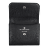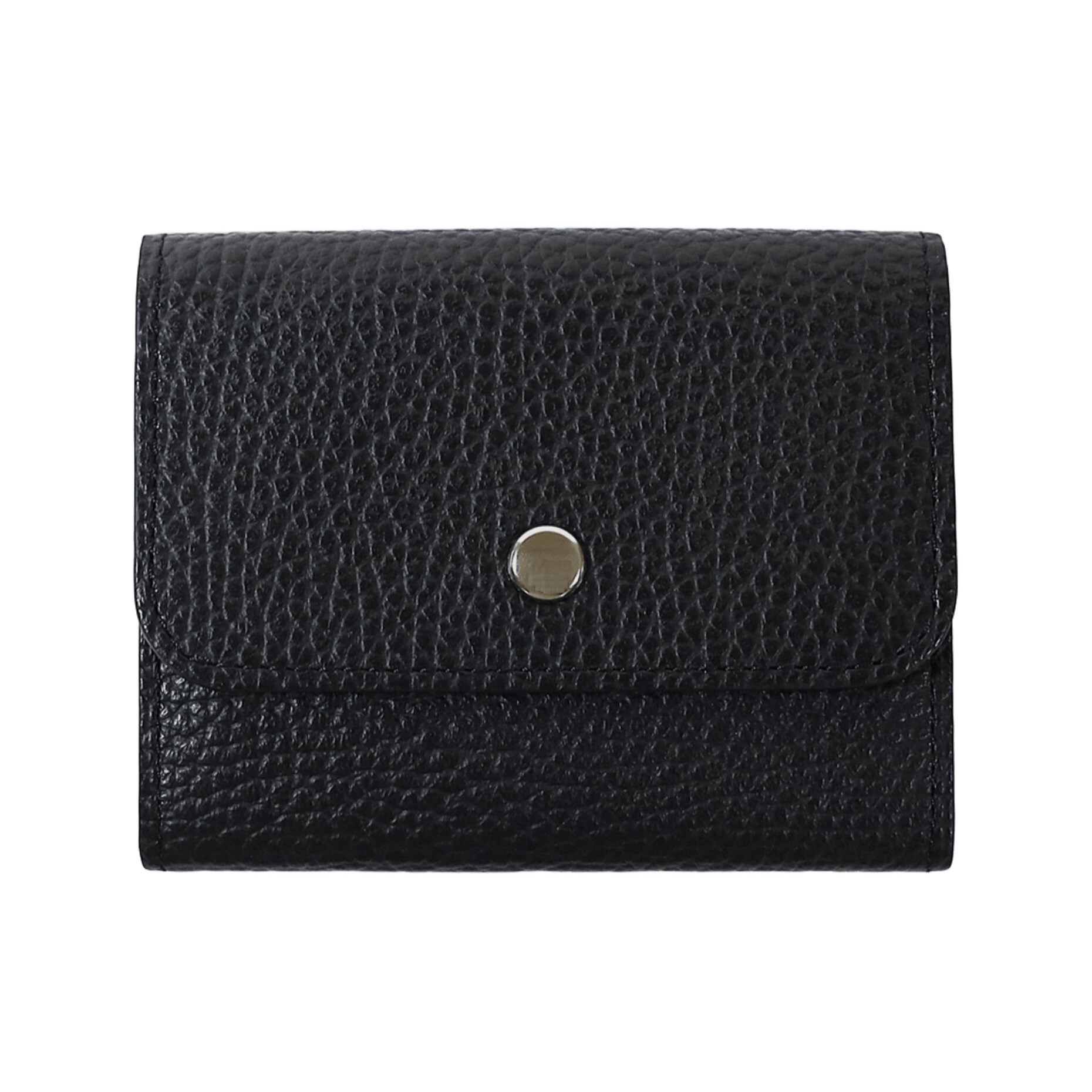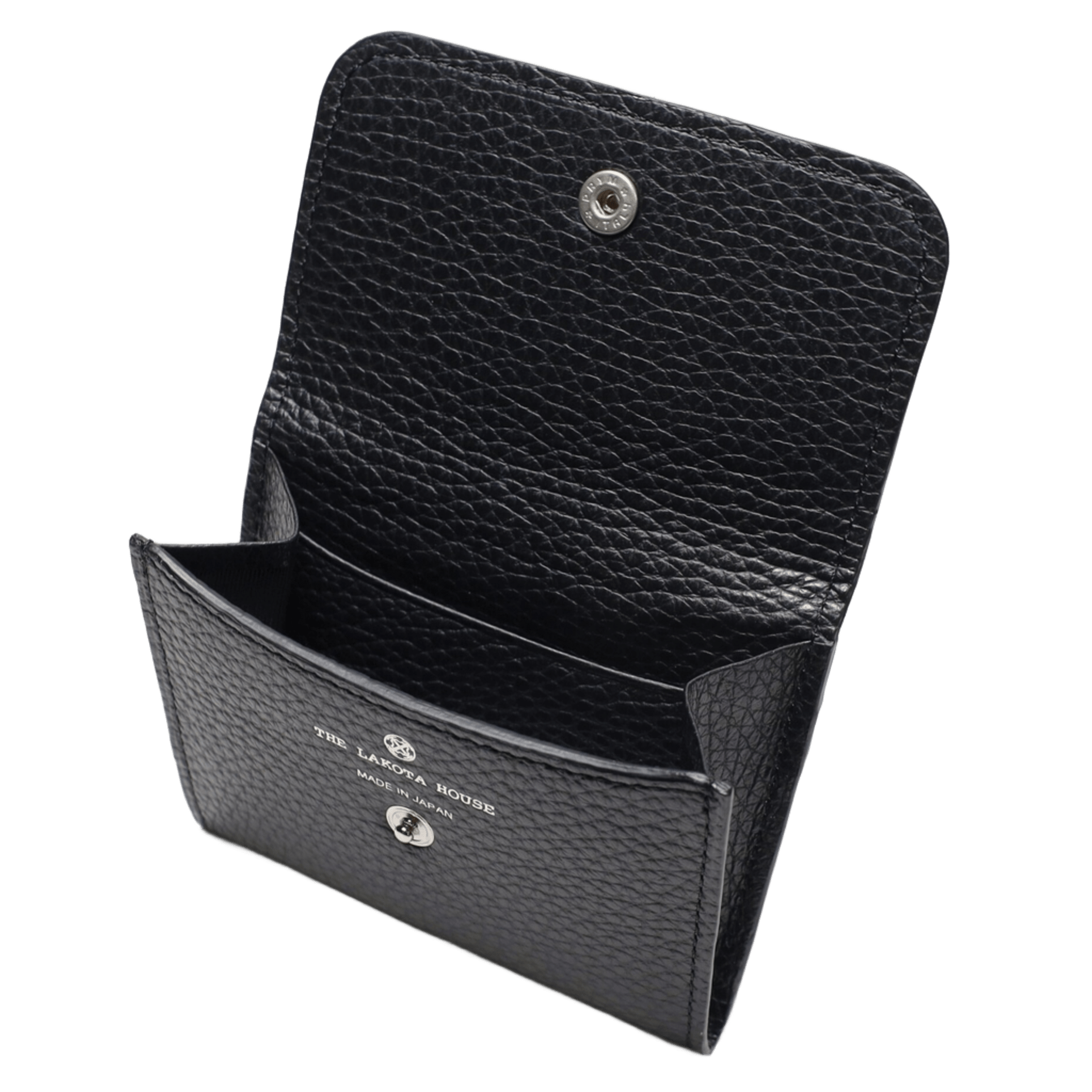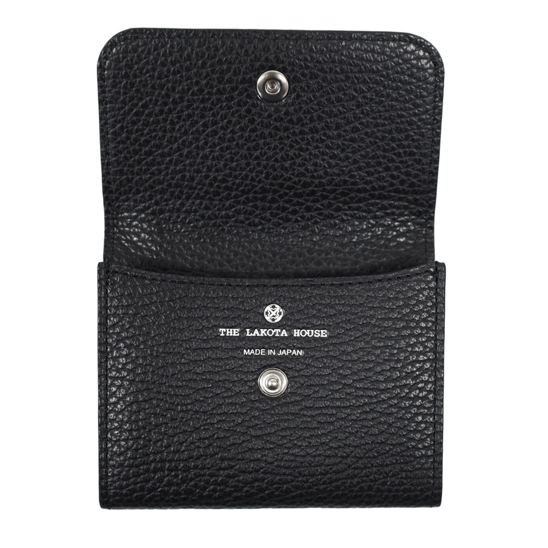 ミニマムなデザインながら必要最低限の収納を備えたCOMPACT WALLET。IC乗車券やクレジットカードなど頻繁に使用するカードの収納に便利な背面カード入れが2つ、その上にはマネークリップ感覚で紙幣を2つ折りにして収納する札室を完備。表面の被せを開くと小銭入れ、更にもう一つ身分証明書などをひと目に付かず収納できるシークレットカード入れを設けています。